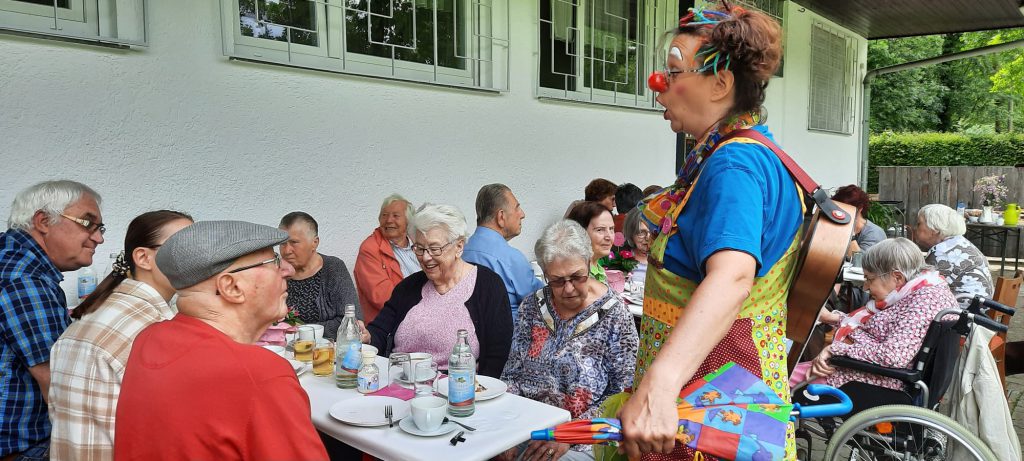 Coronabedingt musste unser traditionelles Sommerfest im vergangenen Jahr leider ausfallen. Mit großer Freude konnte unser Tagespflegeteam unsere Tagesgäste mit einem Familienangehörigen am 16. Juli 2021 vor dem GSV Vereinsheim in Höpfigheim zu einem unterhaltsamen Nachmittag willkommen heißen. Petrus meinte es ausnahmsweise auch mal gut und so stand einem kurzweiligen und unterhaltsamen Miteinander nichts im Wege. Als besondere Überraschung trat Fr. Annette Heeß als „Clown Brösel“ mit ihrem lustigen Auftritt zu einem gelungenen Fest bei.